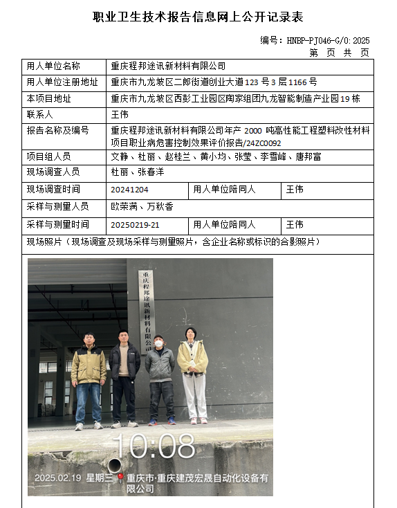 重庆程邦途讯新材料有限公司年产2000吨高性能工程塑料改性材料项目职业病危害控制效果评价报告信息公示