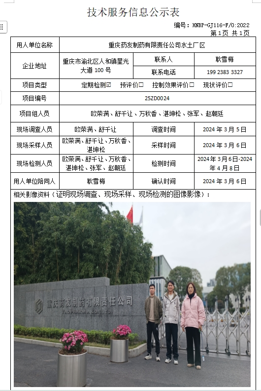 重庆药友制药有限责任公司水土厂区定期检测项目公示