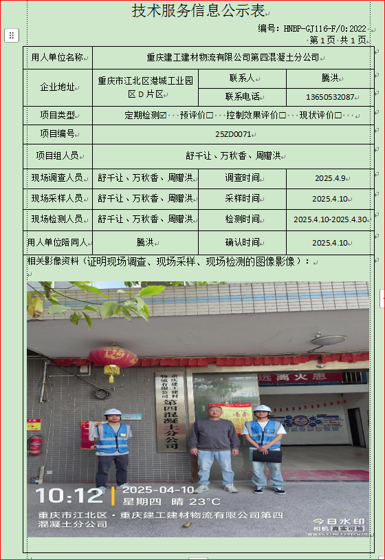重庆建工建材物流有限公司第四混凝土分公司定期检测项目公示