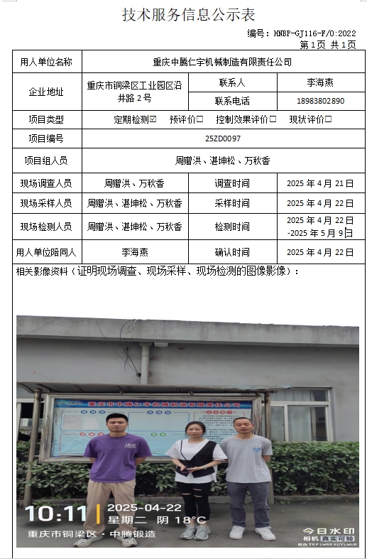 重庆中腾仁宇机械制造有限责任公司定期检测项目公示